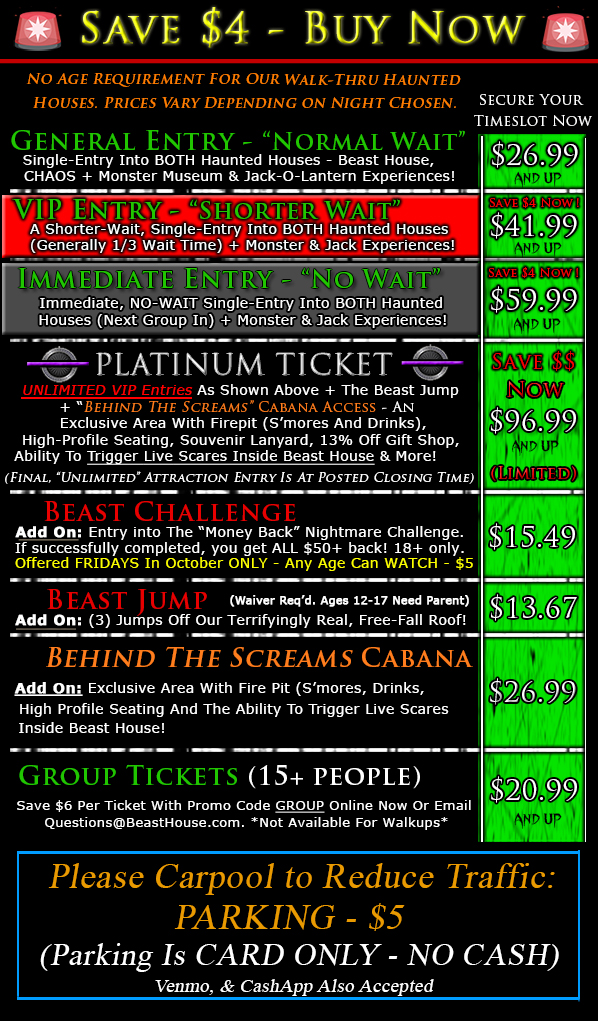 Provides entry into BOTH Haunted Houses – BEAST HOUSE & CHAOS. No Minimum Age Requirements.